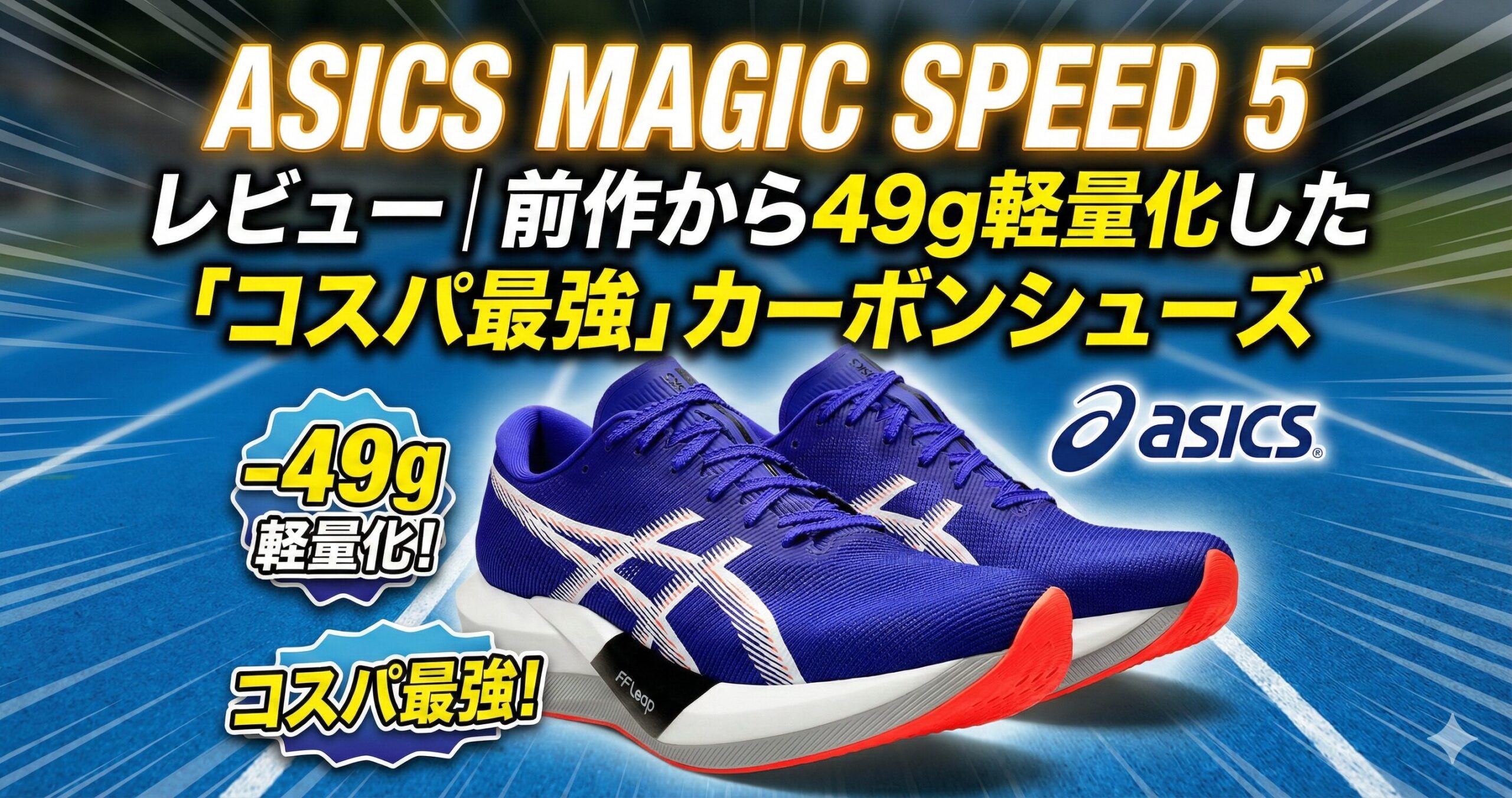 ASICS MAGIC SPEED 5は、前作から49gの大幅軽量化を実現し、上位モデル譲りの素材「FF LEAP」を搭載した注目のカーボンシューズです。定価19,800円という価格でありながら、レビューでは「数年前のエリートシューズ以上の性能」「コスパ最強」と高く評価されています。