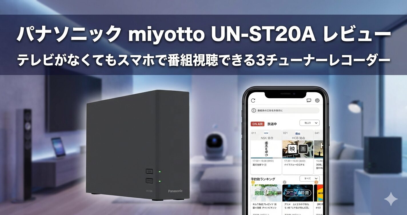 パナソニックのネットワークレコーダー「miyotto(ミヨット)UN-ST20A」は、テレビがなくてもスマートフォンやタブレットで放送中の番組や録画を視聴できる新しいスタイルのレコーダーです。3チューナー搭載で3番組同時録画に対応し、外出先からでも視聴可能なため、テレビに縛られない自由な視聴スタイルを実現してくれます。