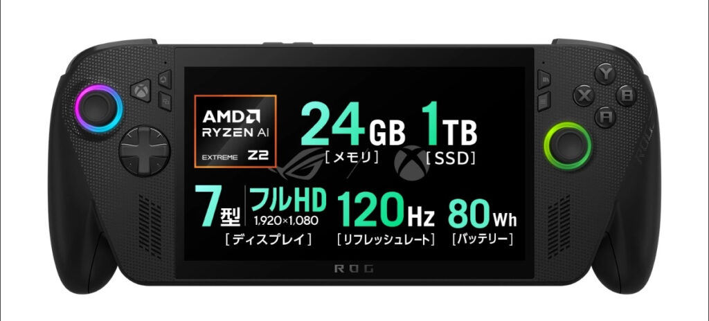 ROG Xbox Ally Xは、ASUSとXboxの共同開発によって生まれた本格派ポータブルゲーミングPCです。Ryzen AI Z2 Extreme・24GBメモリ・80Whバッテリーという充実したスペックで、AAAタイトルも快適に楽しめます。