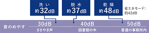 | 運転音(洗い/脱水/乾燥) | 約32dB / 約37dB / 約48dB |