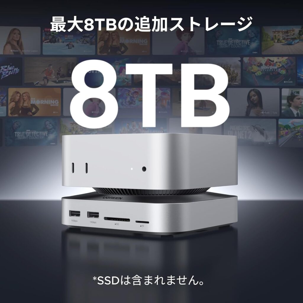 UGREEN Mac mini M4用ドッキングステーション&スタンドは、Mac mini M4の「USB-Aポートがない」「ストレージが足りない」「SDカードが読めない」という悩みを一台で解決してくれる製品です。