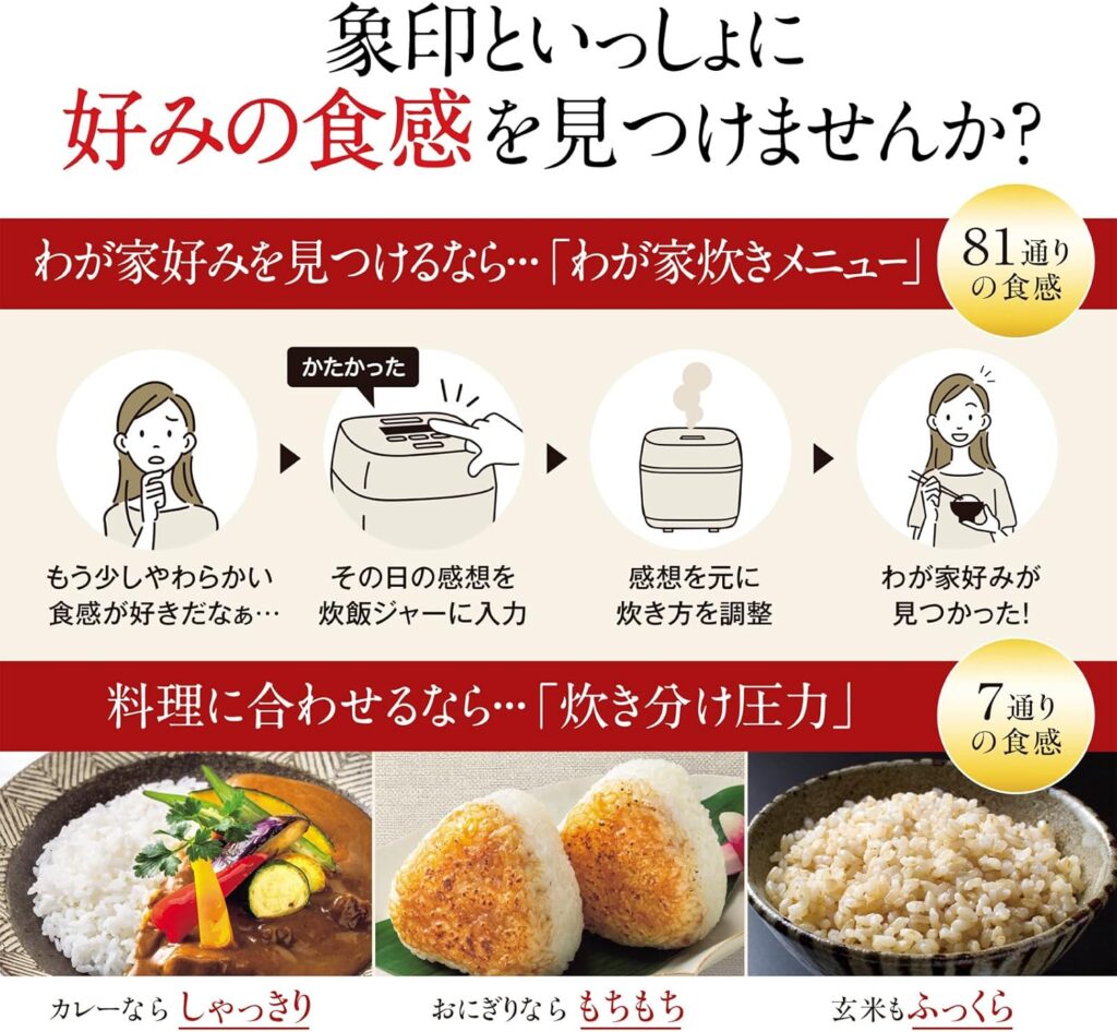 「わが家炊き」機能では、炊き上がりの感想を入力するだけで、次回の炊飯を自動で調整してくれます。粘りの強弱やかたさなど、81通りの炊き方から最適な設定を導き出す仕組みです。