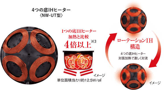 NW-UT07は底IHヒーターを4ブロックに分け、対角線上にある2つのヒーターを同時加熱する「ローテーションIH構造」を採用しています。この仕組みにより、釜内に激しい対流が生まれ、お米一粒一粒に高温の熱が伝わります。